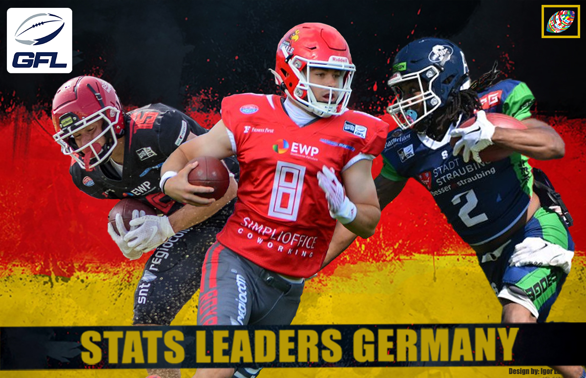 Spinnen umschnallen Angeführt von elektrisierendem RB Lamar Carswell GFL Durchschnittlich 11,6 Yards pro Carry im Rushing mit 1.287 Yards und 17 TDs. Curry-Basar Potsdamer Königshaus Merrill Null, während er für 1,014 Yards und 11 TDs eilt Berliner Rebellen Dritter mit 846 Yards. Braunschweig New Yorker Lions RB Emmanuel Abedi-Bawa ist mit 675 Vierter, gefolgt von David Baum. Könige von Dresden 5. mit 672 Yards.